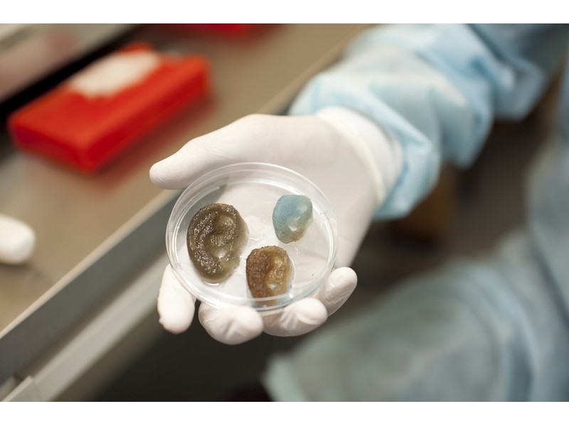 «В качестве первой модели для биопечати выбрали хрящ ушной раковины человека, т.к. он содержит только один тип клеток (хондроциты) и в нем нет кровеносных сосудов, – говорит Юлия Филиппова. – Получить и в течении длительного времени сохранять правильную форму органа оказалось непросто. Пришлось осваивать технологию по статьям, методом проб и ошибок. Иногда Глеб Яцемирский, который отвечал за получение каркаса, чувствовал себя Александром Флемингом, который отрыл пенициллин только по счастливой случайности, забыв убрать чашку со стафилококком с рабочего стола».