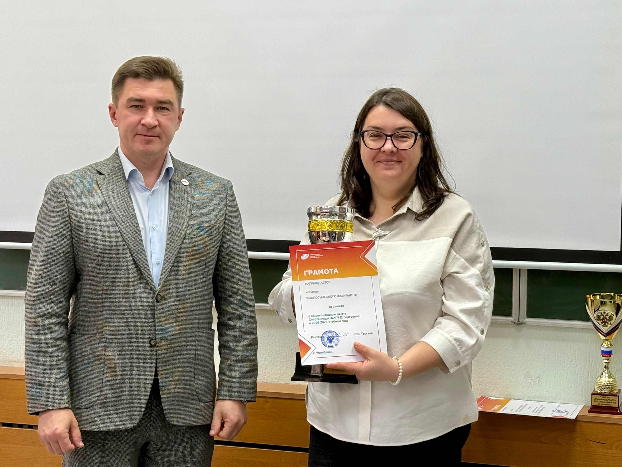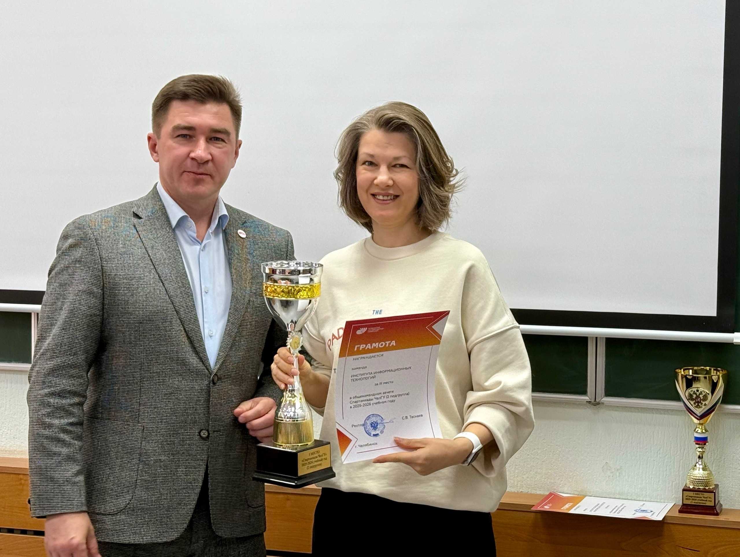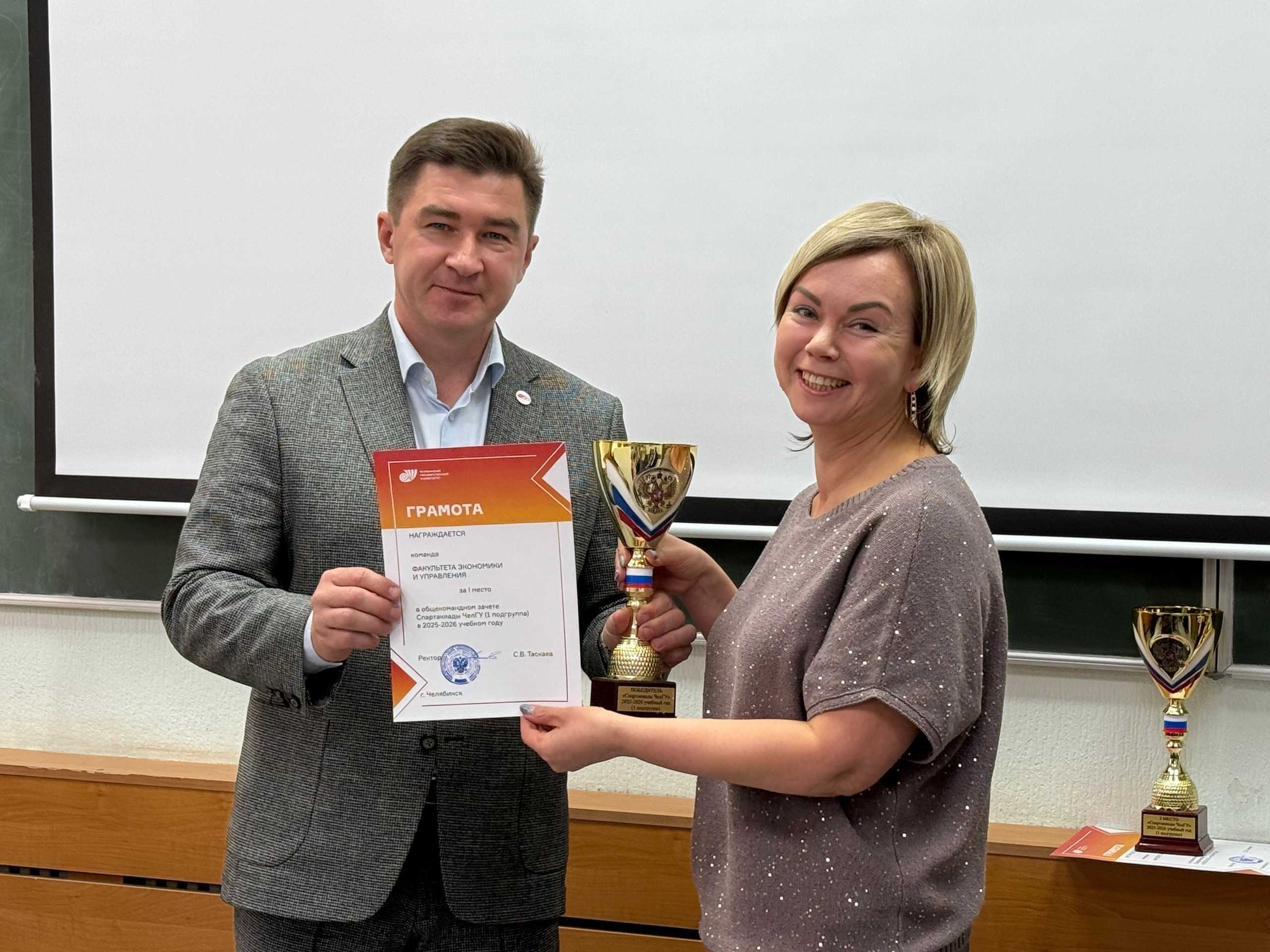 Грамоты и кубки победителей в общекомандном зачёте Спартакиады ЧелГУ 2025-2026 учебного года вручены: