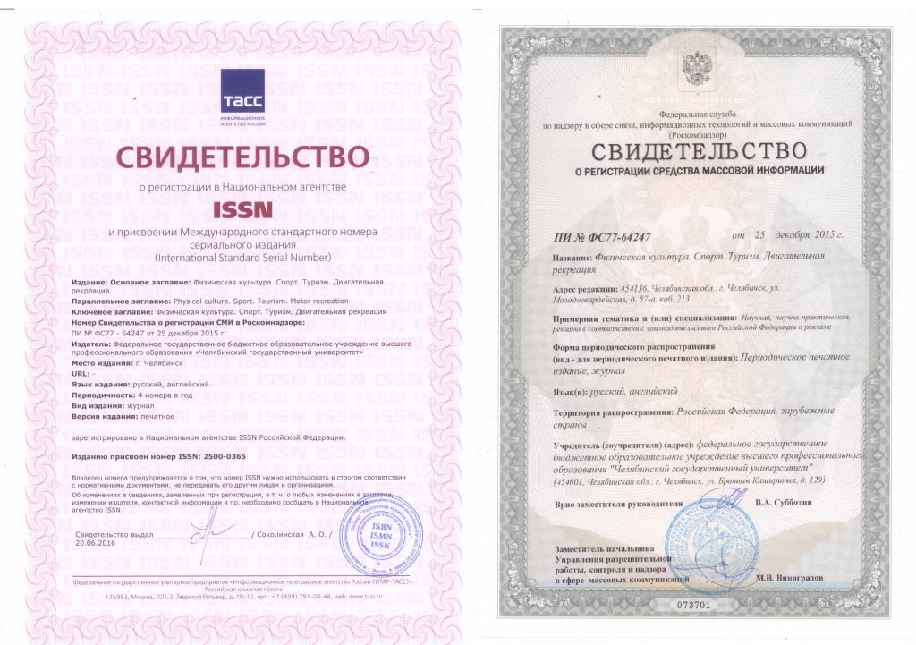 Научный журнал ISSN 2500-0365 «Физическая культура. Спорт. Туризм. Двигательная рекреация»